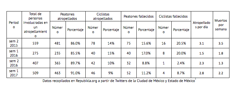De acuerdo a la plataforma Repubikla.org tan solo en la Zona Metropolitana del Valle de México (ZMVM) en el primer semestre del año en curso, 509 personas se han visto involucradas en un atropellamiento, es decir, tres personas al día. En el mismo periodo han fallecido 52 peatones y 4 ciclistas. A su vez de 2015 a la fecha con valores promedio, en cada semestre 438 personas se ven involucradas en un atropellamiento, dando como resultado dos personas muertas por semana.