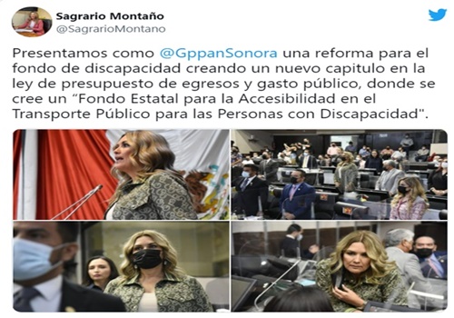 Para beneficiar a personas con discapacidad en Sonora, la bancada del Partido Acción Nacional (PAN) presentó una iniciativa al Congreso local para crear un Fondo Estatal para la Accesibilidad en el Transporte Público para las Personas con Discapacidad, presentada por la diputada Sagrario Montaño Palomares.