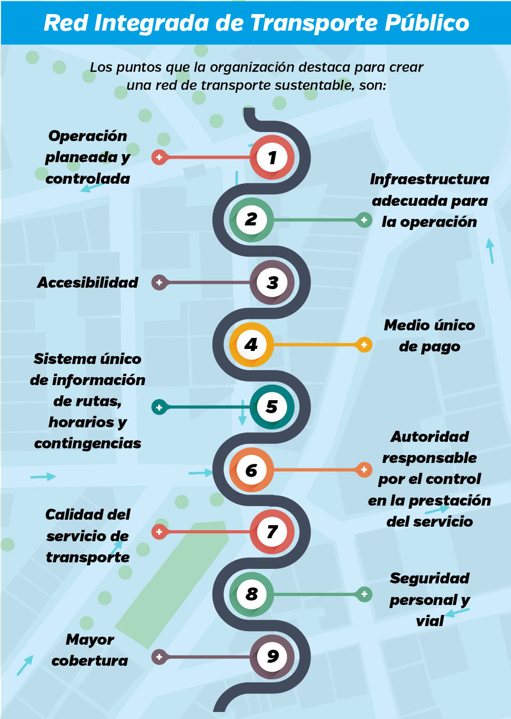 Una de las propuestas que el WRI México plantea para mejorar la calidad del transporte público, es crear una red integrada de transporte público, que garantice calidad y cobertura, a través de la integración de los diferentes modos de transporte con infraestructura adecuada, servicios planeados, tarifa integrada y tecnología de punta para los vehículos, el recaudo, el control, la información y servicio al usuario.