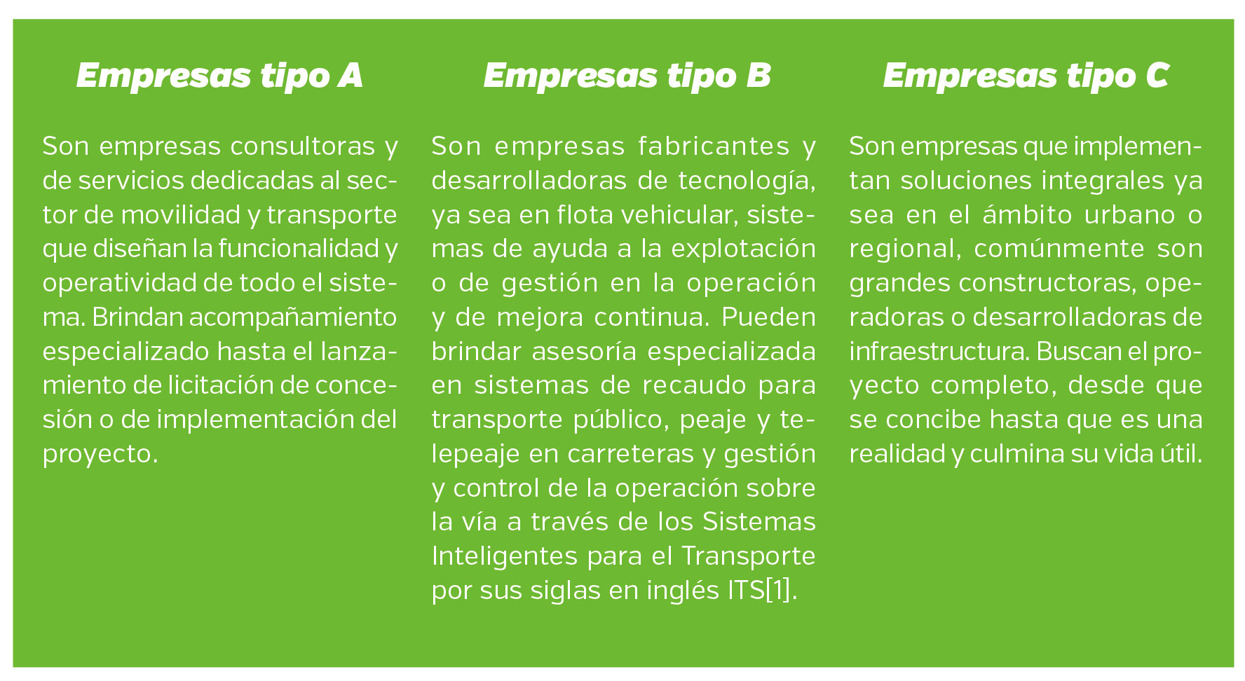 Diversas son las oportunidades de negocio para quienes estén interesados en el mercado de las infraestructuras de transporte, ya que, podrían captar proyectos desde el diseño y concepción del sistema hasta la construcción de infraestructura y provisión de tecnologías que mejoren la gestión en la operación. De manera general, y a definición propia, los siguientes tipos de empresas podrían verse interesadas:
