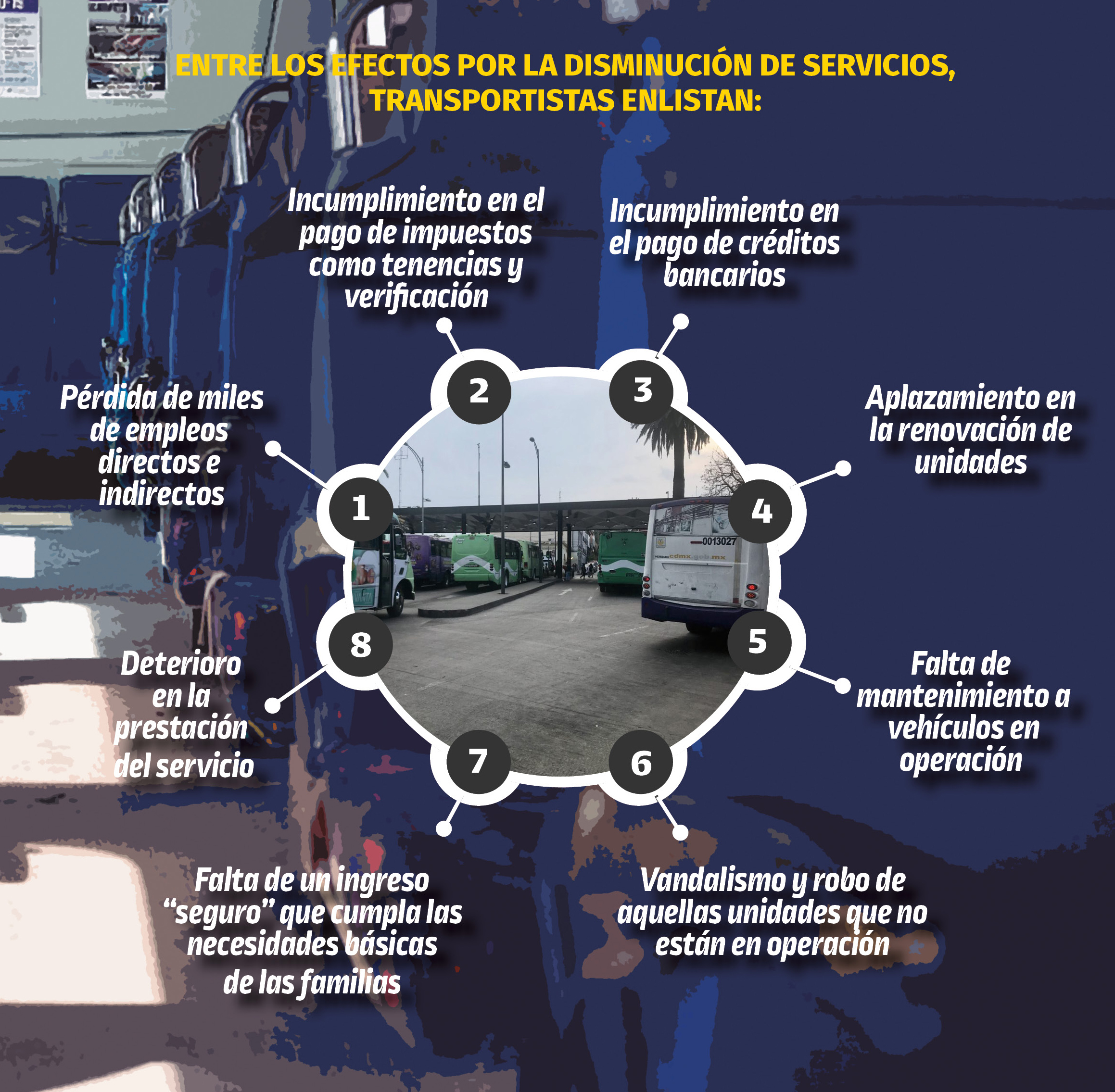 Entre las problemáticas a las que se enfrentan propietarios y conductores, coinciden que se ha tenido que reducir la flota de unidades lo que ha ocasionado que no puedan cumplir con el pago de las mensualidades de aquellas que aún están en financiamiento; asimismo, quienes aún no han podido renovar sus unidades se ven imposibilitados en hacerlo debido a que el ingreso que se percibe actualmente “no llega ni alcanzar el mínimo que cubra sus necesidades básicas de alimentación, salud e incluso educación para sus hijos.