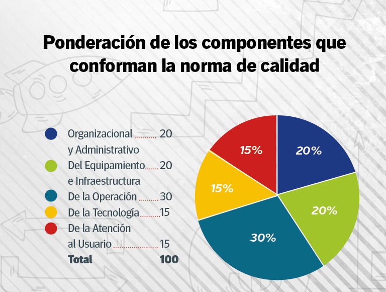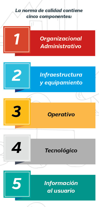 La norma de calidad establece una serie de requerimientos en los siguientes rubros: parámetros organizacionales, de infraestructura, operativos, tecnológicos, de información y atención al usuario que deberán cumplir las empresas de transporte. Además incluye la aplicación de una encuesta de percepción y una evaluación del servicio.