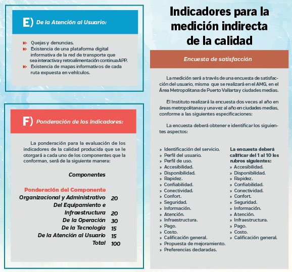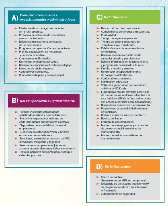 Además de los criterios de evaluación que incluye diversos indicadores, señala la realización de una encuesta de percepción de los usuarios; el documento contiene también aspectos que deben cubrir los prestadores del servicio de transporte, que en el caso de poblaciones mayores a 50 mil habitantes tendrán que constituirse como personas jurídicas, tales como el componente organizacional y administrativo.