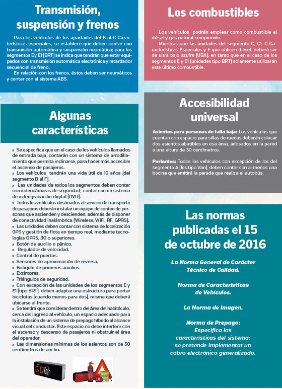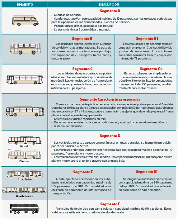 La norma de las características que deben tener los vehículos para el servicio masivo, colectivo, urbano o conurbado, suburbano y características especiales,  contempla una serie de unidades distribuidas en una decena de segmentos, en los que se detallan las especificaciones de las unidades y el tipo de ruta en el que operarán.