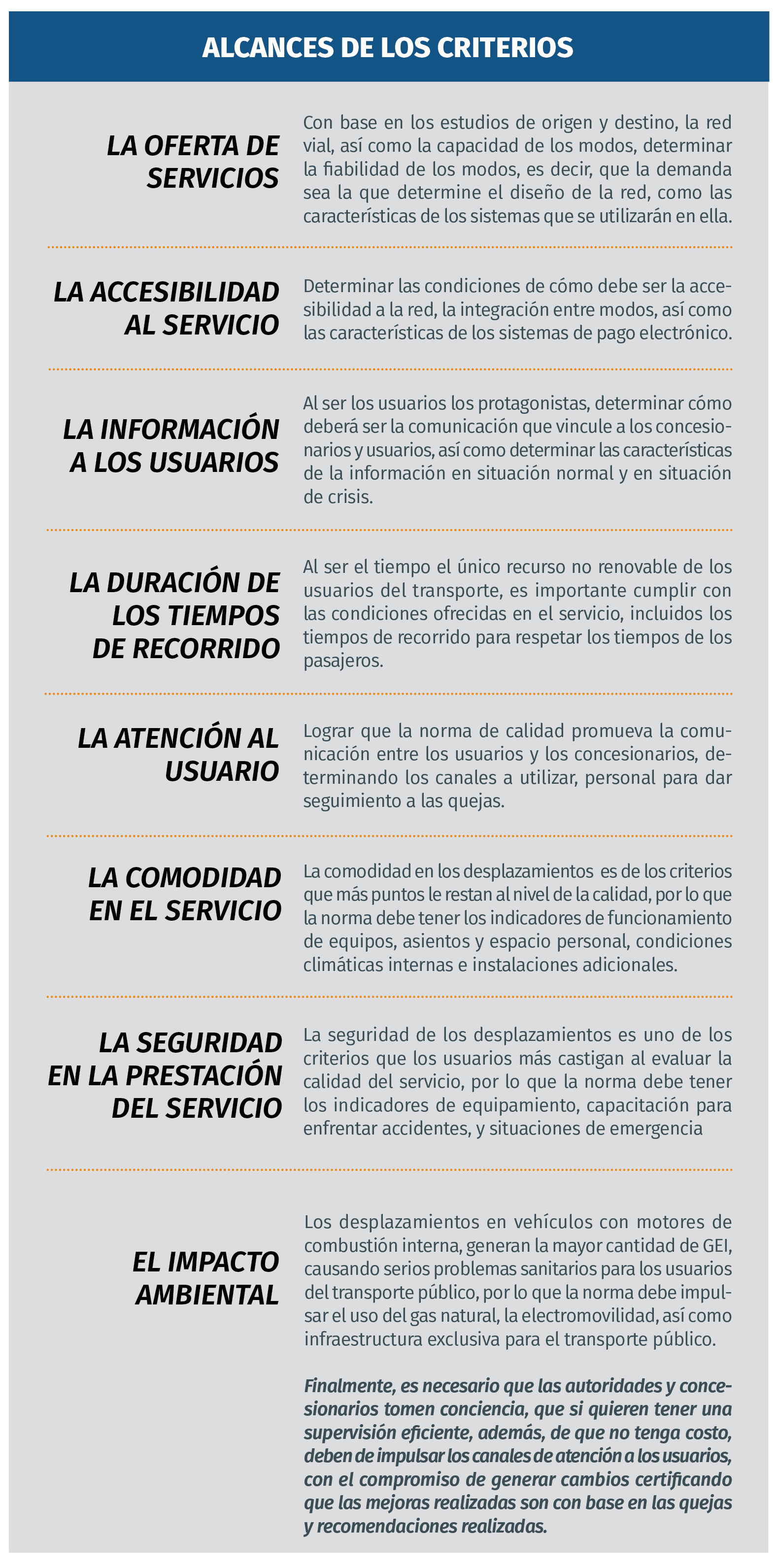 Los criterios definidos por la norma 13816 creo son lo suficientes para medir la calidad del servicio de transporte público, por lo que sería conveniente que de forma colegiada los concesionarios del servicio, se reúnan para consolidar una norma local, donde el usuario sea el protagonista de la mejora continua. De acuerdo a la norma, a continuación describo los alcances de los criterios.