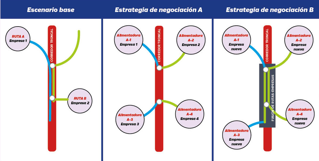 La estrategia a seguir es crear cuatro rutas alimentadoras al eje troncal (estrategia de negociación A), tal como se muestra en la figura. Con esta solución los concesionarios, en caso de resultarles rentable aceptarían, sin embargo, en la mayoría de los casos no es así, ya que argumentarían que se les está restando participación en el mercado y por ende pérdida de ingresos, lo cual impactaría de manera negativa en la modernización de sus vehículos con las capacidades, tecnología y modelos requeridos. Ante ello, la autoridad tendría dos estrategias de réplica. En la primera podría analizar a fondo la viabilidad de la solución y en caso de ser factible mostrar los resultados a los concesionarios para una nueva negociación, dejando claro que ese sería el límite de la misma. En caso de que la solución no fuese viable, entonces en la segunda estrategia (estrategia de negociación B) se podría optar por la fusión de empresas, de tal forma se les brinde a los concesionarios una participación en el mercado del corredor en el tramo que inciden sobre el mismo, la única condicionante es que deberán hacer la compra de vehículos acorde a las necesidades funcionales y operativas de dicho corredor. La distribución del ingreso para cada socio de la empresa podría hacerse con base a los ascensos y descensos que se registren sobre cada ruta fusionada en el tramo.