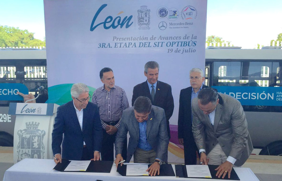 En el marco de la presentación de los avances del proyecto, se develó el prototipo de las unidades Mercedes-Benz que recorrerán la red Optibús, que estuvo encabezado por el C. Héctor López Santillana, Presidente Municipal de León; Luis Ernesto Ayala Torres, Presidente de la Comisión de Movilidad de H. Ayuntamiento; Carlos Medina Placencia, Integrante de la Comisión de Movilidad del H. Ayuntamiento Luis Enrique Moreno Cortés, Director General de Movilidad; Daniel Adolfo Villaseñor Moreno, Presidente Transportistas Coordinados de León; Hugo Eduardo Dorado Navarro, Presidente de Alianza de Transportistas Urbanos de León; Biólogo Ricardo de la Parra Bernard, Director General de Medio Ambiente y Raúl González Cepeda, Director de Ventas, Mercadotecnia y Postventa de Mercedes-Benz Autobuses.