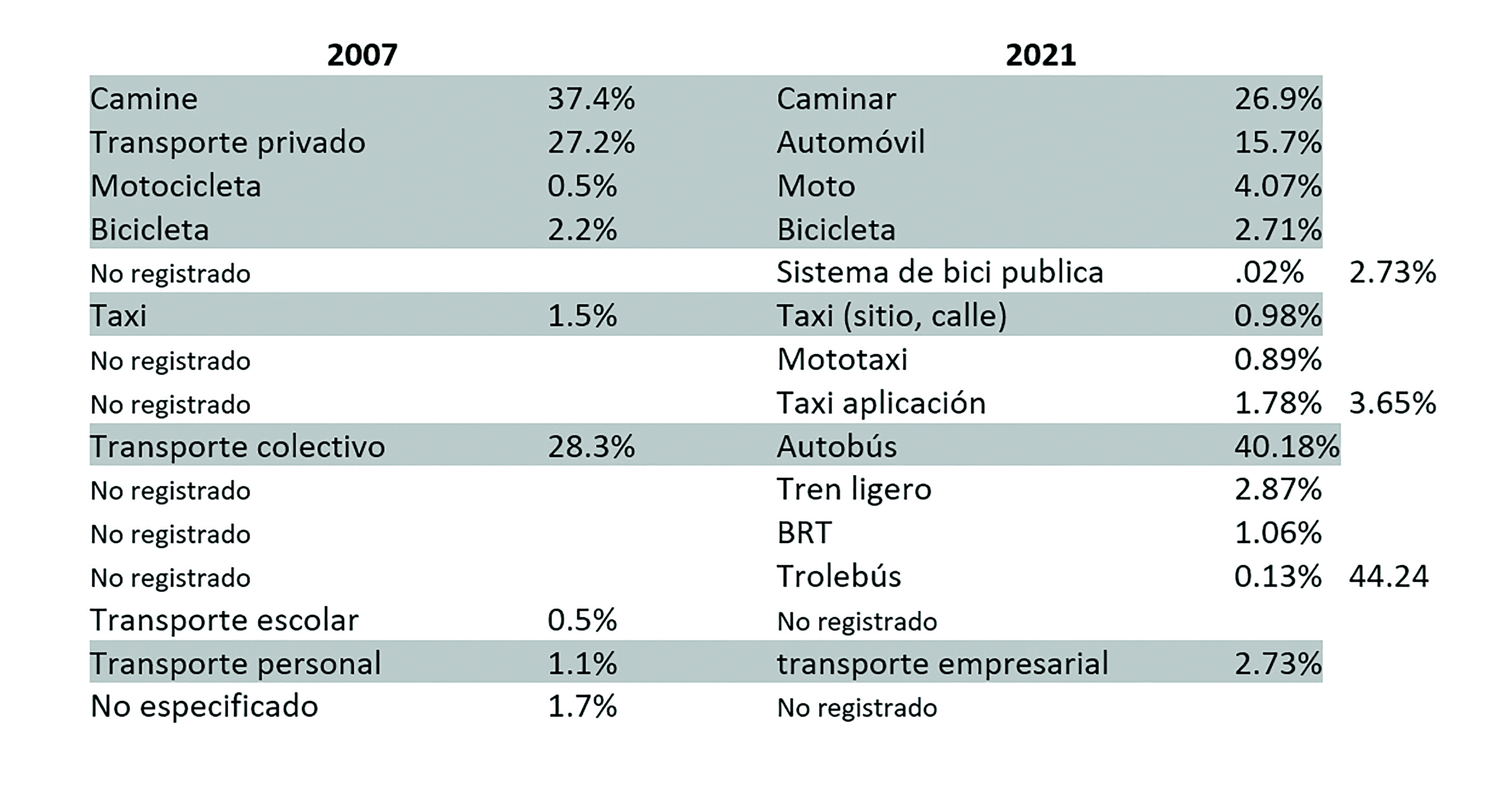 Seis. La distribución modal de los viajes en los ejercicios 2007 y 2021, presentaron los resultados siguientes: