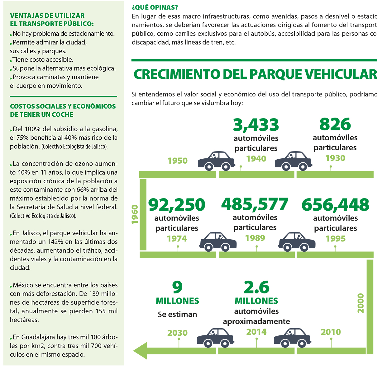 Es un hecho que en las zonas metropolitanas de las ciudades más grandes del país, las formas y necesidades de desplazamiento entre distintos puntos es de suma importancia. Cada vez es más común que el trabajo o los lugares de consumo de sus habitantes estén a mayor distancia de la ubicación de sus viviendas. En el imaginario popular, tener un auto es la solución ante los retos de desplazamiento con los que un ciudadano debe lidiar, sin embargo, es la opción más problemática en la movilidad de las ciudades: Genera tráfico, contamina, provoca estrés, genera gastos de mantenimiento y combustible, promueve el sedentarismo… esto solo de primera intención, pues profundizando aún más, también provoca un mayor gasto público, puesto que hay que crear, mantener y arreglar las vialidades necesarias para su circulación, y subsidiar la gasolina, por mencionar algunos aspectos; esto, además de costoso, solo beneficia a una tercera parte de la población aproximadamente, que no es la que menos tiene y encima reduce, e incluso desaparece espacios públicos y deforesta áreas verdes. El uso del automóvil también provoca miles de muertes por accidente al año: Muchas más que el transporte público, aunque las percepciones se empeñen en creer lo contrario.