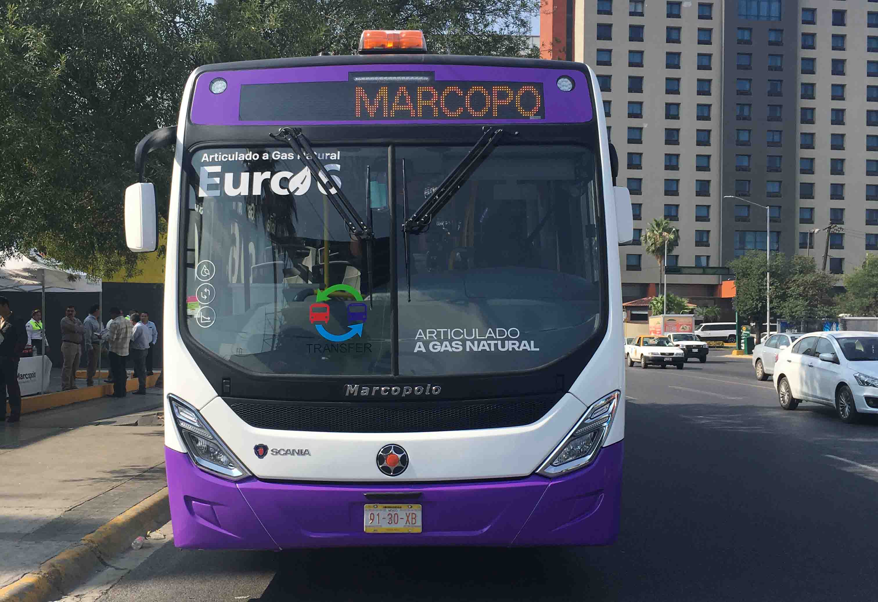 Mediante un recorrido realizado por las calles principales de Monterrey, Nuevo León, se mostró la eficiencia del vehículo y sus características, destacando su chasis Scania K320 carrozado por la firma brasileña Marcopolo.