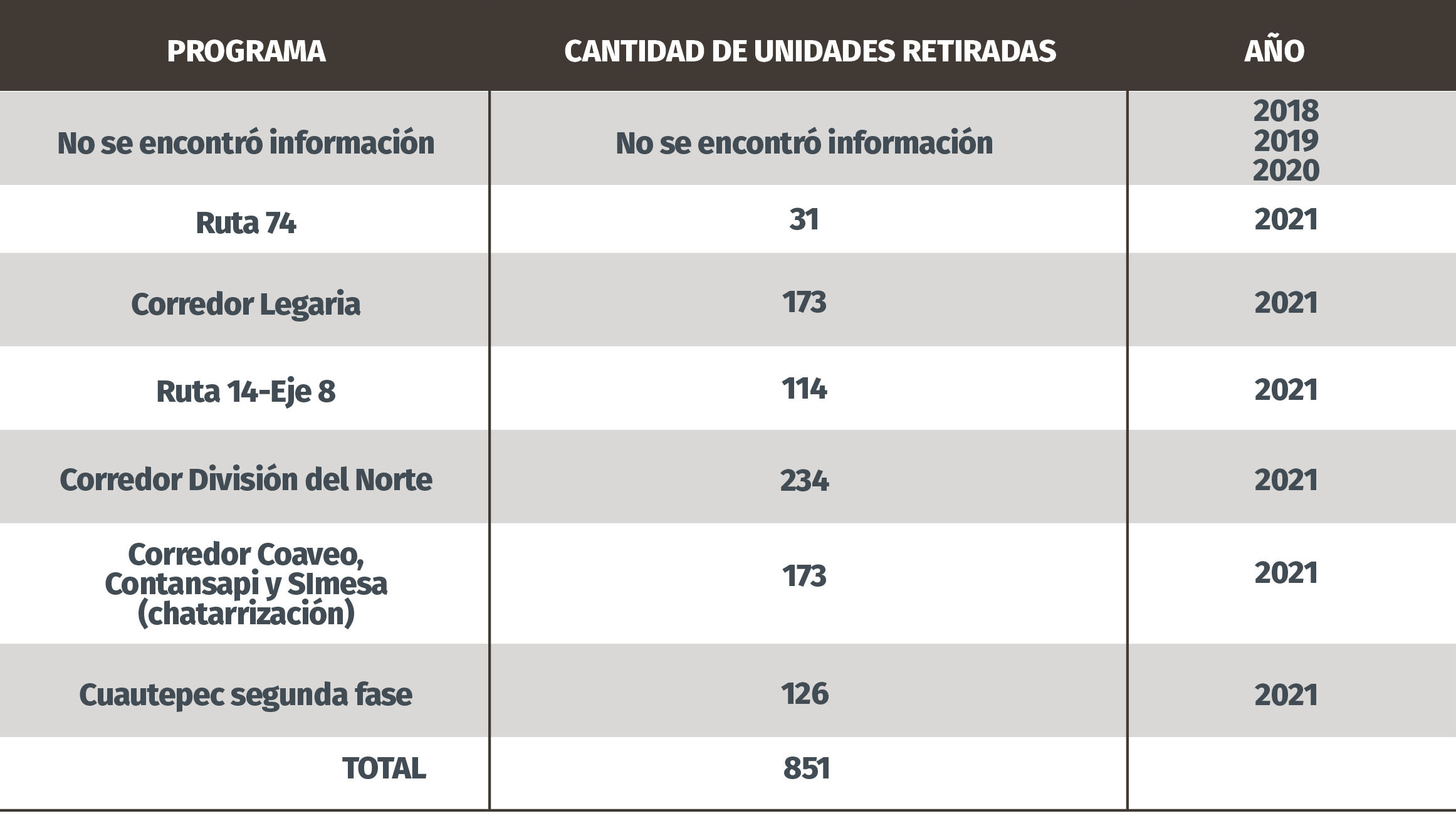 Aunque la autoridad local señala que para los siguientes dos años se retirarán de circulación 5,800 unidades, de acuerdo con información oficial emitida por la Secretaría de Movilidad (SEMOVI), ésta dice desconocer cuántos vehículos de este tipo se han sacado de circulación desde el inicio de gestión de la titular de gobierno, Claudia Sheinbaum.