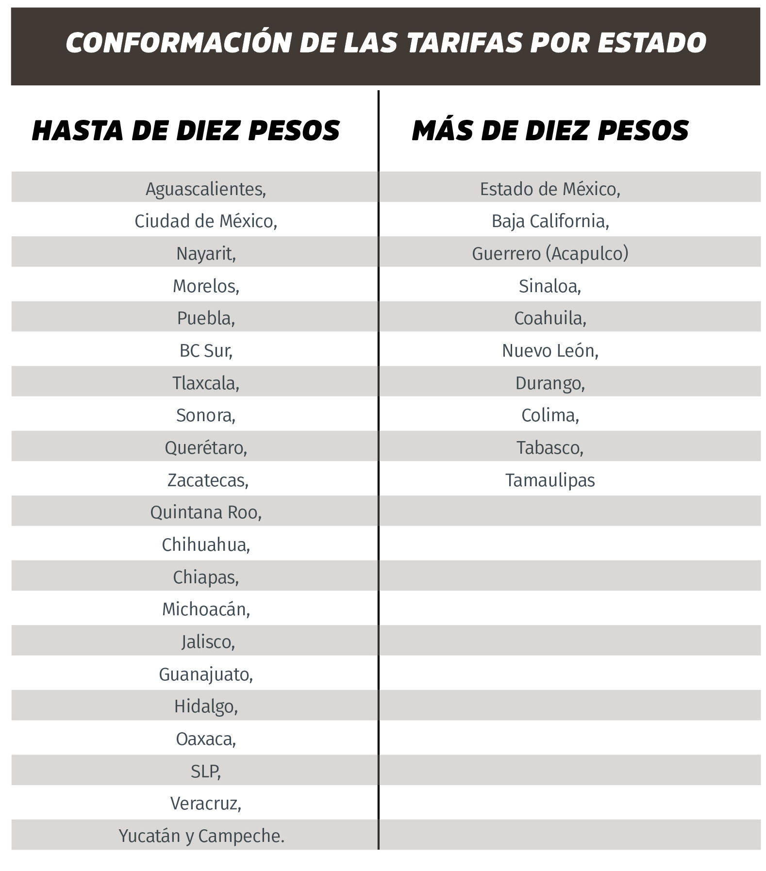 Nota: aun en el mismo estado, dependiendo la región geográfica, el costo puede variar. Por ejemplo, en Acapulco el costo de las unidades de transporte público puede cambiar dependiendo si cuentan o no con aire acondicionado. O por ejemplo en Quintana Roo, donde el precio puede variar dependiendo si se está en Chetumal y Cancún.