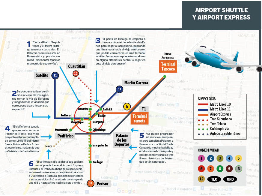“Para conceptualizar esos servicios expreso, por supuesto que se necesita un estudio detallado de demanda y cuesta una fortuna, pero creo yo que podría financiarse. ¿Cuánto cuesta? La equis de cuatro vías, las Líneas 10 y 11 del Metro, y el Airport Shuttle, cuestan 130 mil millones de pesos, aproximadamente. ¿Cómo se pagarían? Sin construirlos con prisas, a 15 años; habría que encargarse de conseguir alrededor de 10 mil millones de pesos por año.